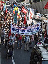 続いて、戦争動員の「国民保護」に反対する連絡会の仲間の決意表明があり、さらに、ピリカ全国実・関西の仲間は、アイヌ民族の自決権を支持しアイヌ民族と連帯してサミットに反対することを訴えた。関西単一労組の仲間は、反帝国主義労働運動の必要性を訴えた。参戦と天皇制に反対する連続行動の仲間は、サミットをめぐって策動される天皇制強化の動きを批判した。釜パトの仲間は、サミット会場周辺からの野宿者排除を糾弾し、サミット弾圧に屈せず反サミット闘争をたたかうことを訴えた。